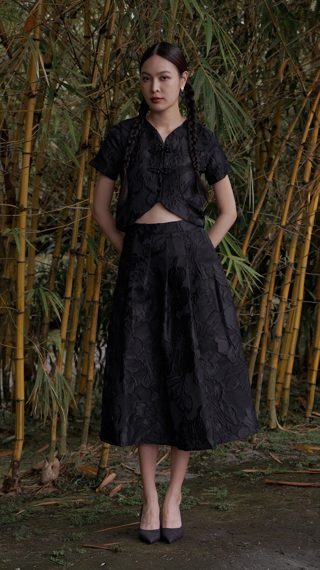 Blossom dress crafted from Black/white-sheen, sumptuous jacquard, featuring a floral-embossed pattern that captures the poetic essence of this season’s collection. Accented with an arched hem and a V-shaped neckline, featuring a mandarin collar and dual crystal-petal pankou closures with a hidden safety button. Designed with short sleeves, a cropped length, and a fully lined interior.
