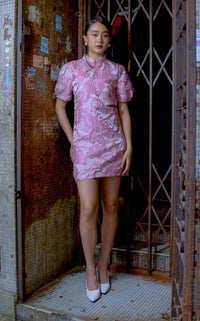 Blossom Dress crafted from pink-sheen sumptuous Jacquard, featuring a floral embossed pattern that captures the poetic essence of this season's collection.Accented with a mandarin collar paired with pearl cluster floral-beaded Pankou, featuring a back concealed zipper closure, slant-front panel, bias cut-outs at the chest and one side of the waist, puff sleeves, and a mini length.