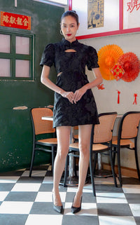 Blossom dress crafted from black-sheen, sumptuous jacquard, featuring a floral-embossed pattern that captures the poetic essence of this season’s collection. Accented with peekaboo silhouette cutouts at the chest and waist, a mandarin collar paired with decorative pearl-cluster floral-beaded pankou, and designed with a back concealed zipper closure, pleated puff sleeves, and a mini length.