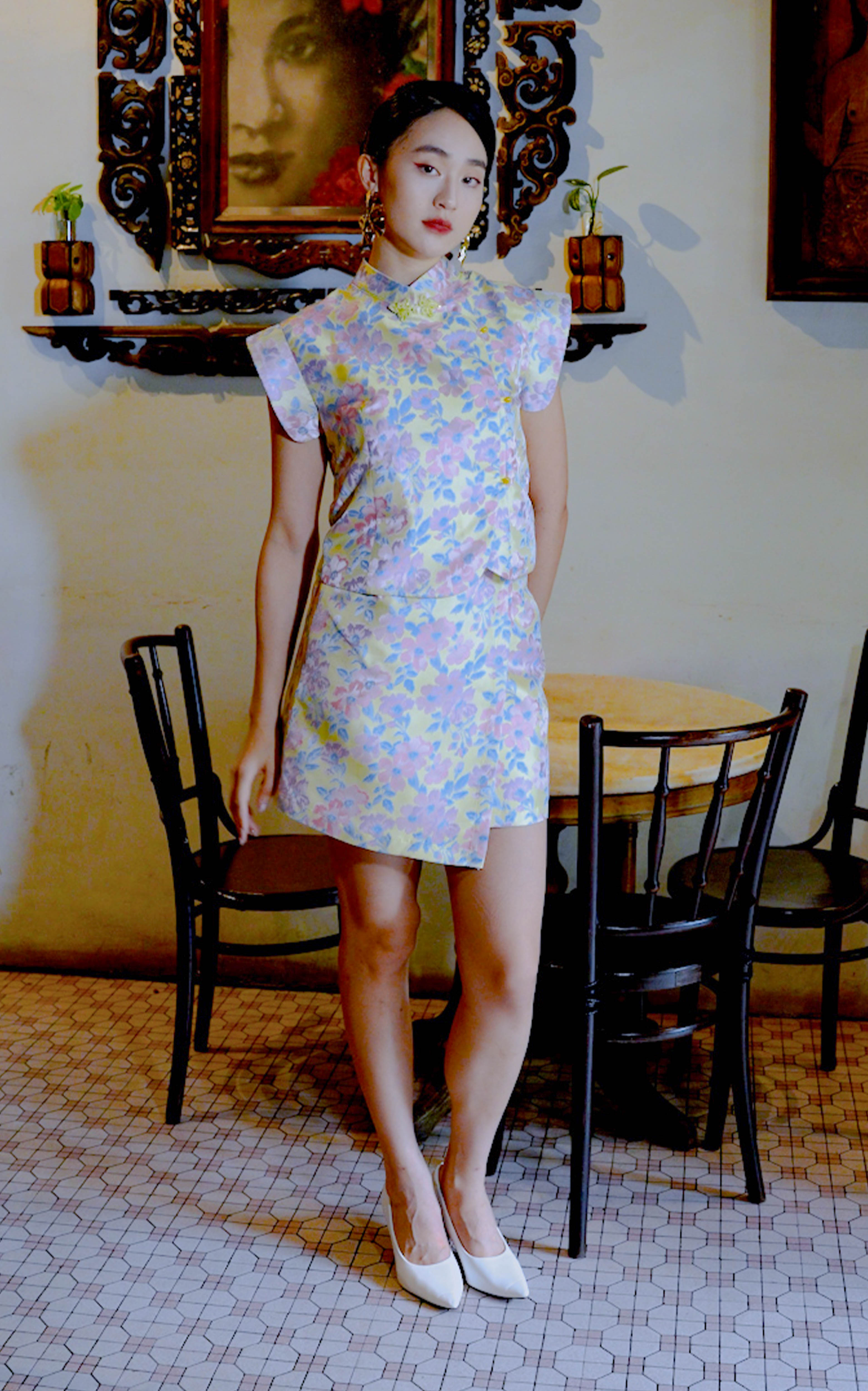 Cheongsam Top crafted from soft yellow Jacquard with a softly veiled glow, featuring woven floral motifs and delicate blue leaf accents.Accented with a mandarin collar and diagonal front overlap, featuring long tube-beaded Pankou, cuffed sleeves, a curved hem, and a fully lined interior.