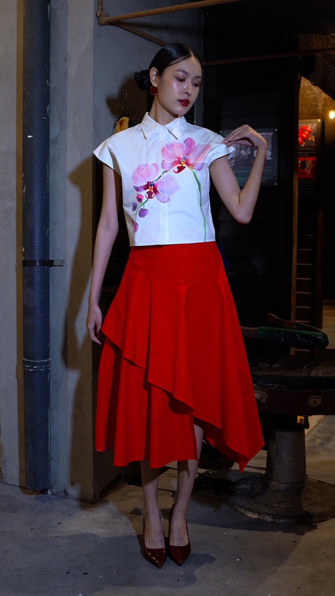 Cheongsam-inspired shirt adorned with painterly orchid prints, symbolising elegance and grace, crafted from airy, easy-care cotton. Featuring a mandarin collar, button loop closure, darting along the front and back for a flattering fit, and cap sleeves with a cropped length.