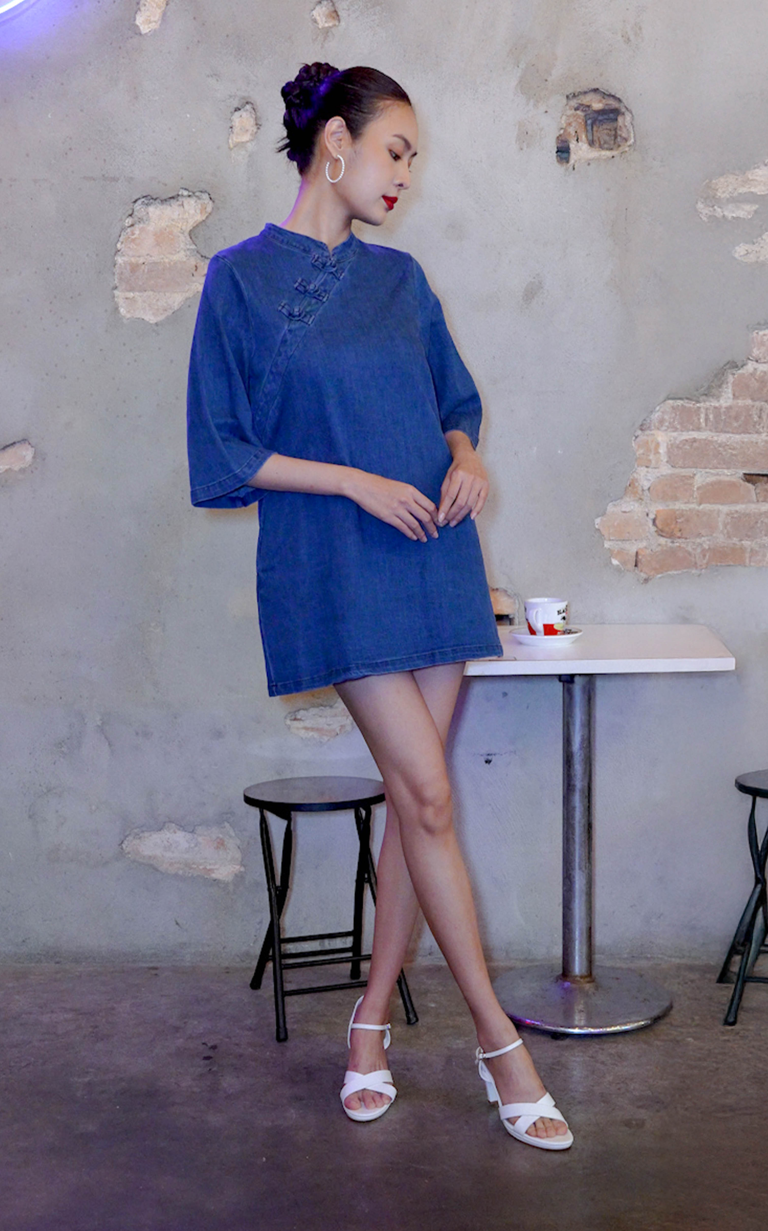 Cheongsam dress crafted from supple, lightweight washed denim, featuring a mandarin-style slant-front panel and collar with a button-loop closure. Designed with flare 3/4 sleeves, both side pockets, and a loose, oversized fit.