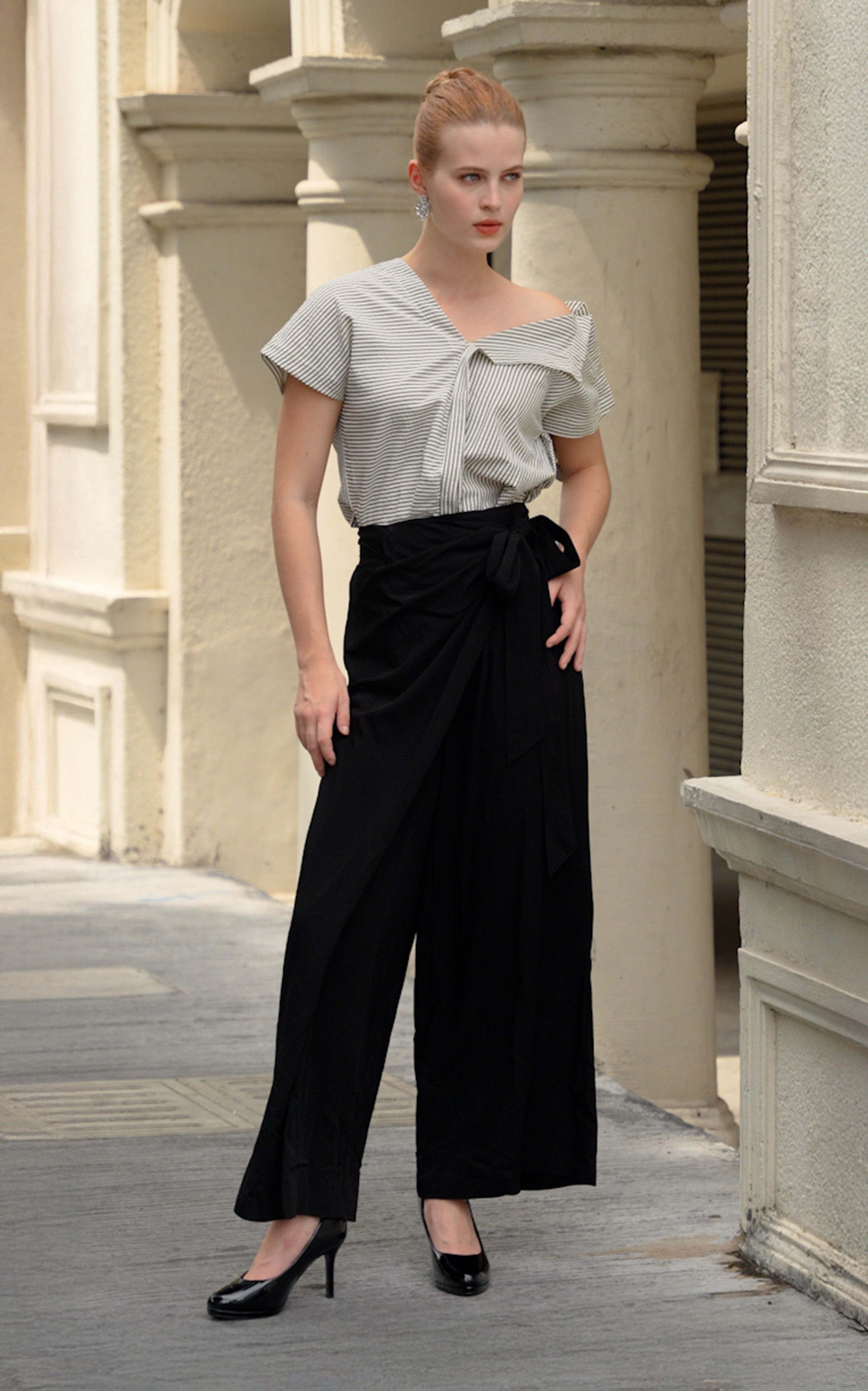Mid-rise pants crafted from silky-soft, crinkled ripple-textured fabric. Featuring a self-wrap front and an elasticized waistband at the back. Pleated and gathered for a fluid, relaxed silhouette.