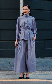 Top crafted from lightweight mini gingham-check cotton, featuring a layered front panel. Designed with a stand collar and double-button fastening, a detachable sash tie, and a front button-down closure. Finished with long sleeves with cuffs, a front yoke, and an oversized silhouette.