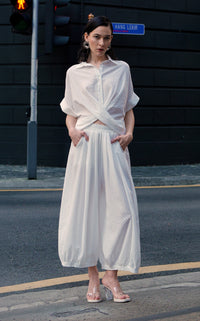 Natural-rise pants crafted from a wrinkle-resistant blended fabric with a bubble texture. Featuring a full elastic waistband and gathered detailing that forms a soft balloon silhouette. Complete with functional pockets at both sides and finished with a structured cuffed hem.