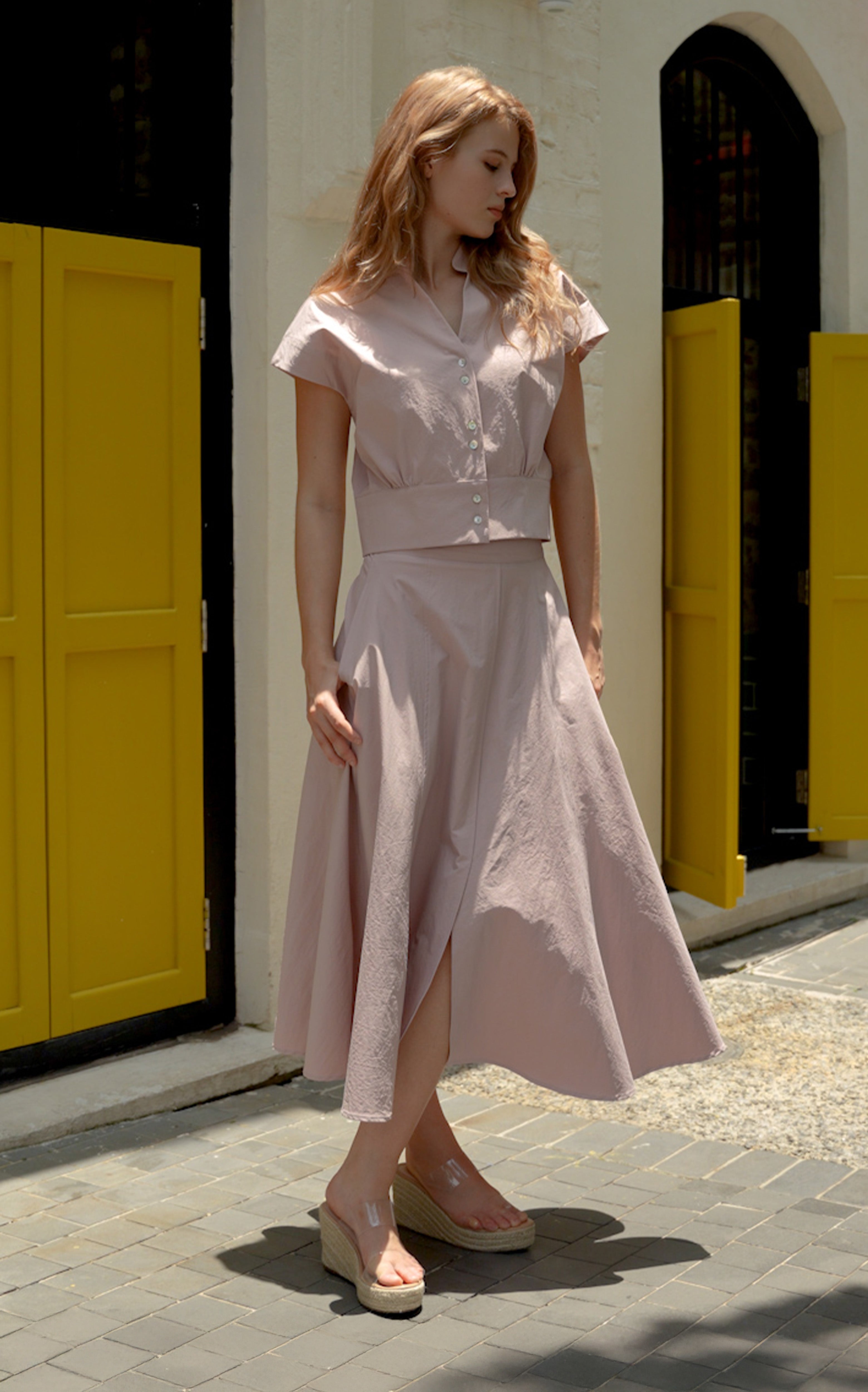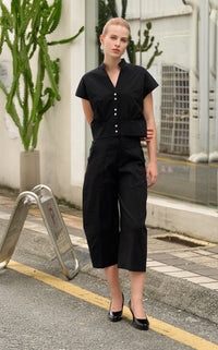 V-neck top crafted from airy, easy-care cotton with a softly crinkled texture. Designed with a stand collar, pearl button-down front, and gathered details at the waist for a softly defined shape. Finished with cap sleeves and a wide waistband panel.