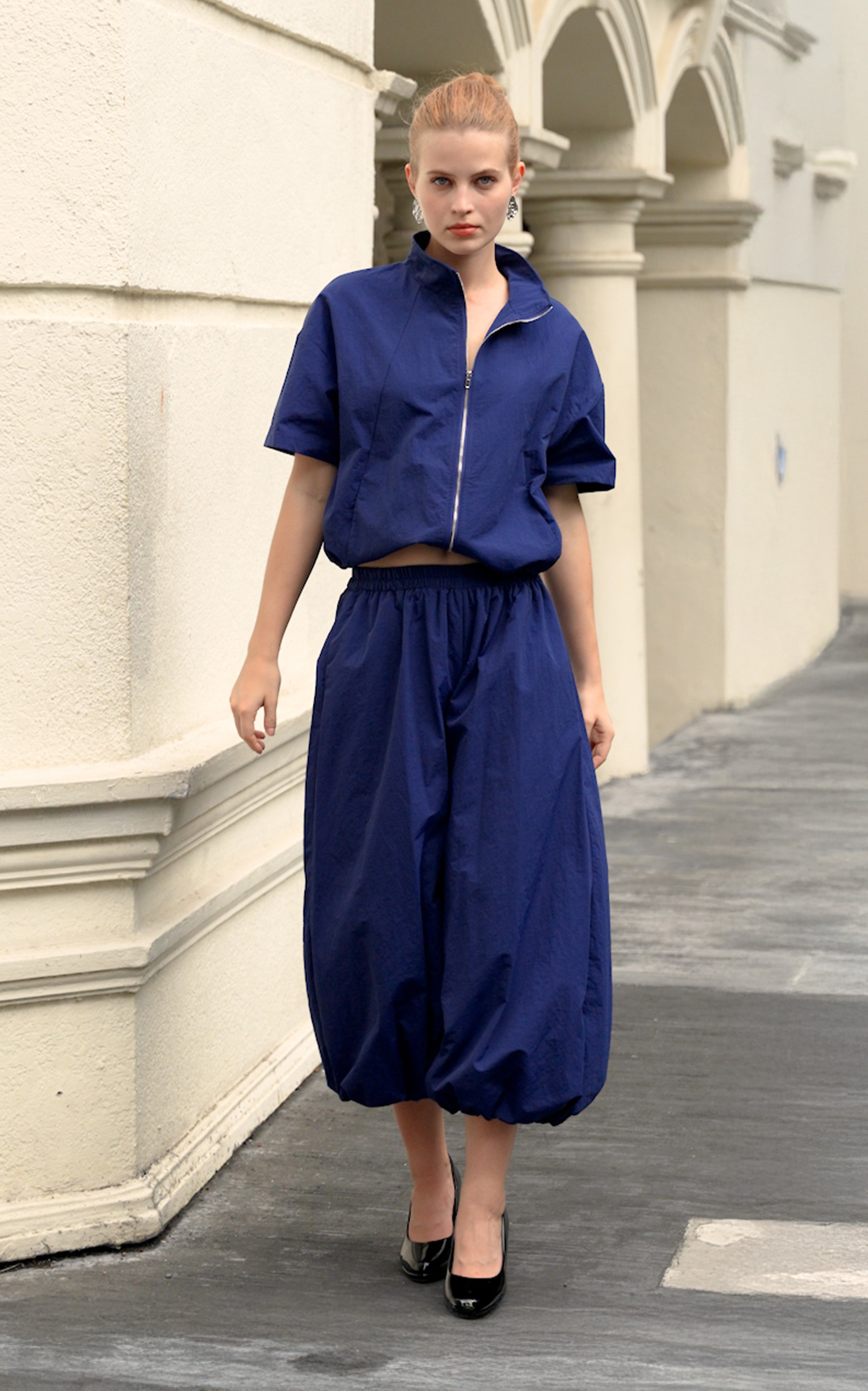 High-neck top crafted from crease-resistant, softly crinkled textured cotton. Designed with a front metal zip closure, paneled construction, and front seam pockets. Finished with a waist metal spring drawcord for an adjustable shape and a boxy fit.