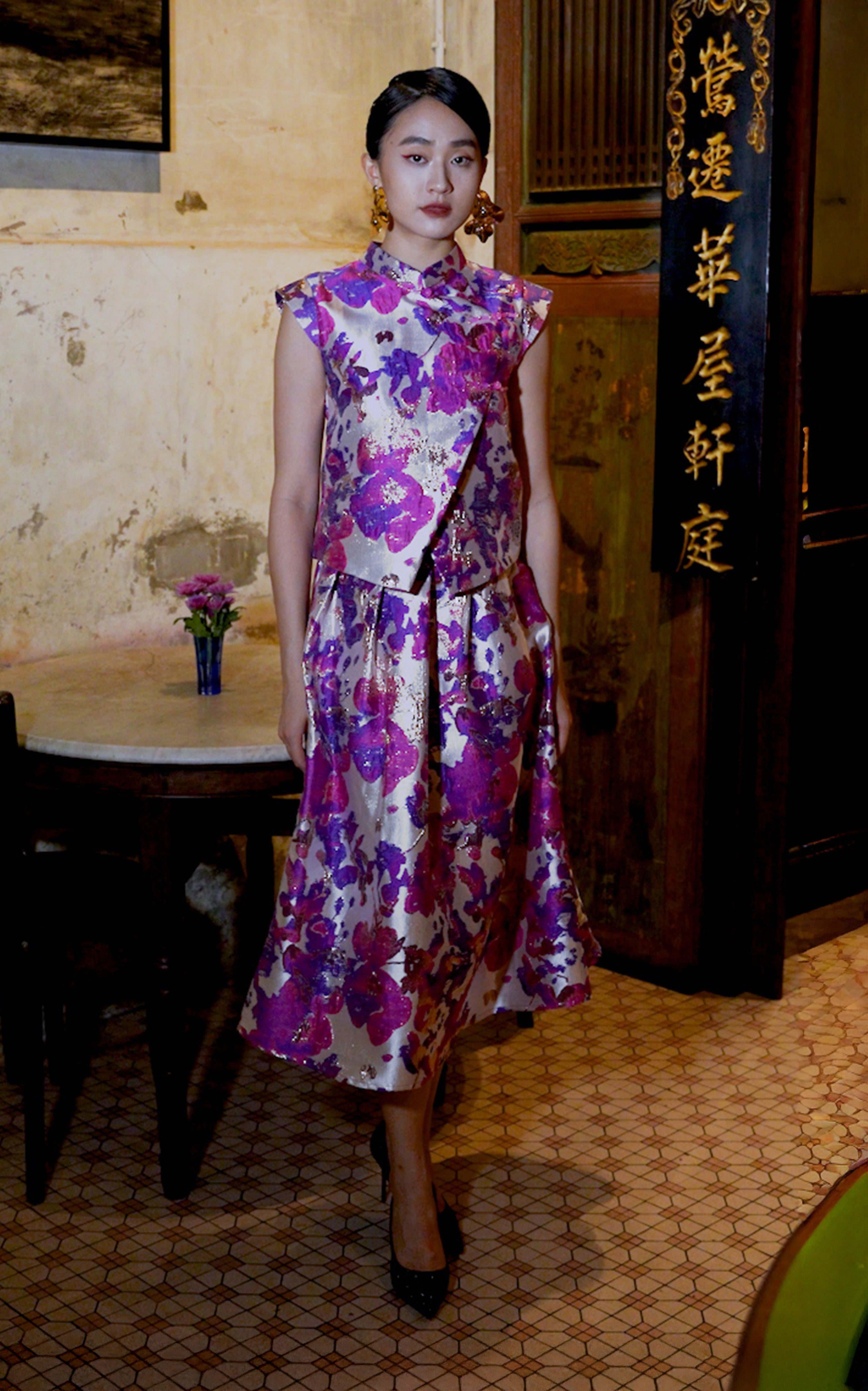 Luxe Cheongsam Top crafted from sculpted Jacquard in amethyst-pink tones, enhanced with an opalescent weave that imparts a subtle aureate radiance.Accented with a mandarin collar and diagonal front overlap, featuring long tube-beaded Pankou, cap sleeves, a pointed front hem, and a fully lined interior.
