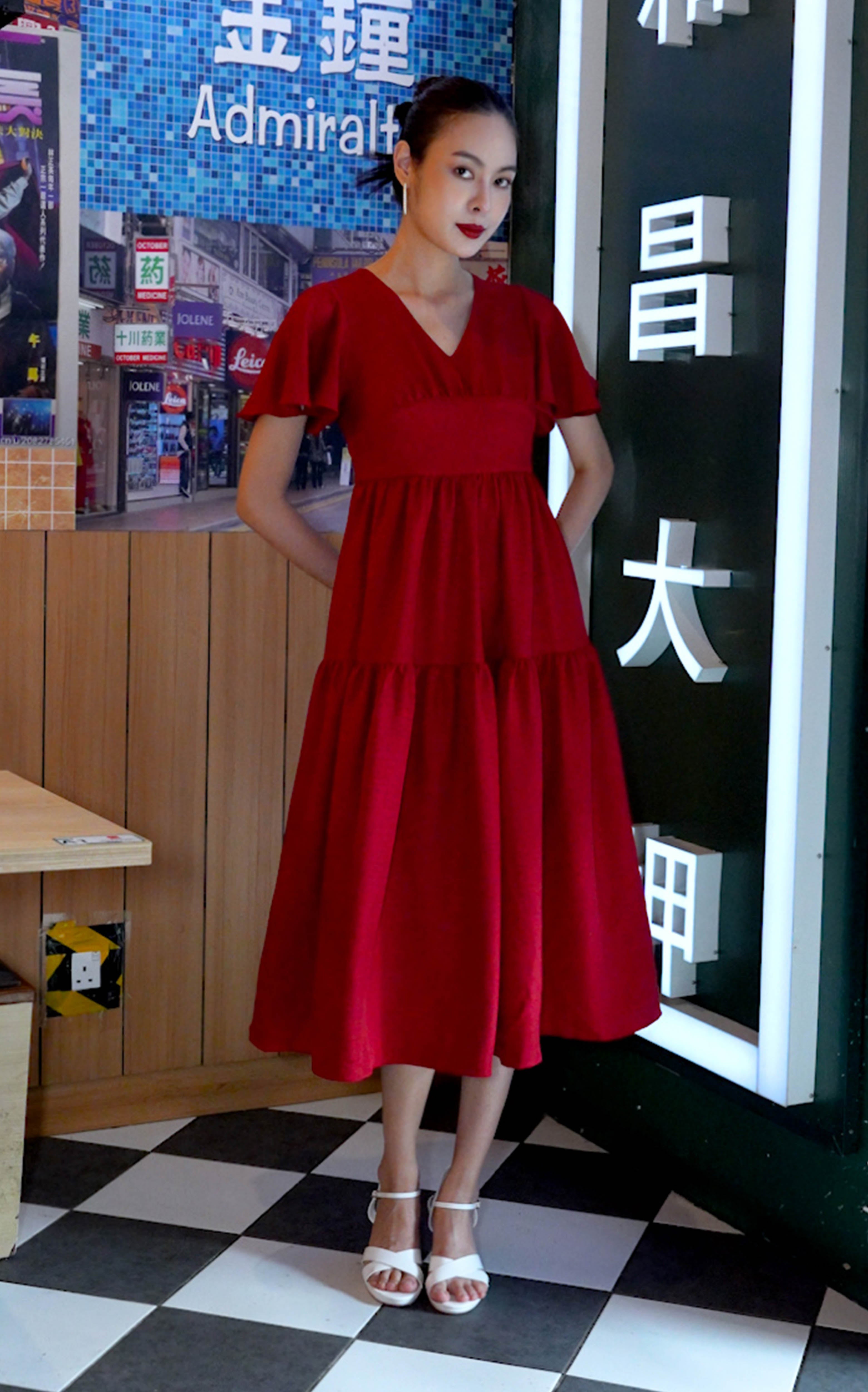 V-Neck Flutter Sleeves Cotton Dress - Maroon / S