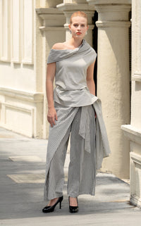 Asymmetry top in subtly textured striped fabric, featuring a versatile asymmetric neckline that can be styled off-shoulder or one-shoulder. Accented with an artfully pleated shoulder drape and a flowing side tail, finished with a concealed side zip. Sleeveless, cut to a below-waist silhouette.