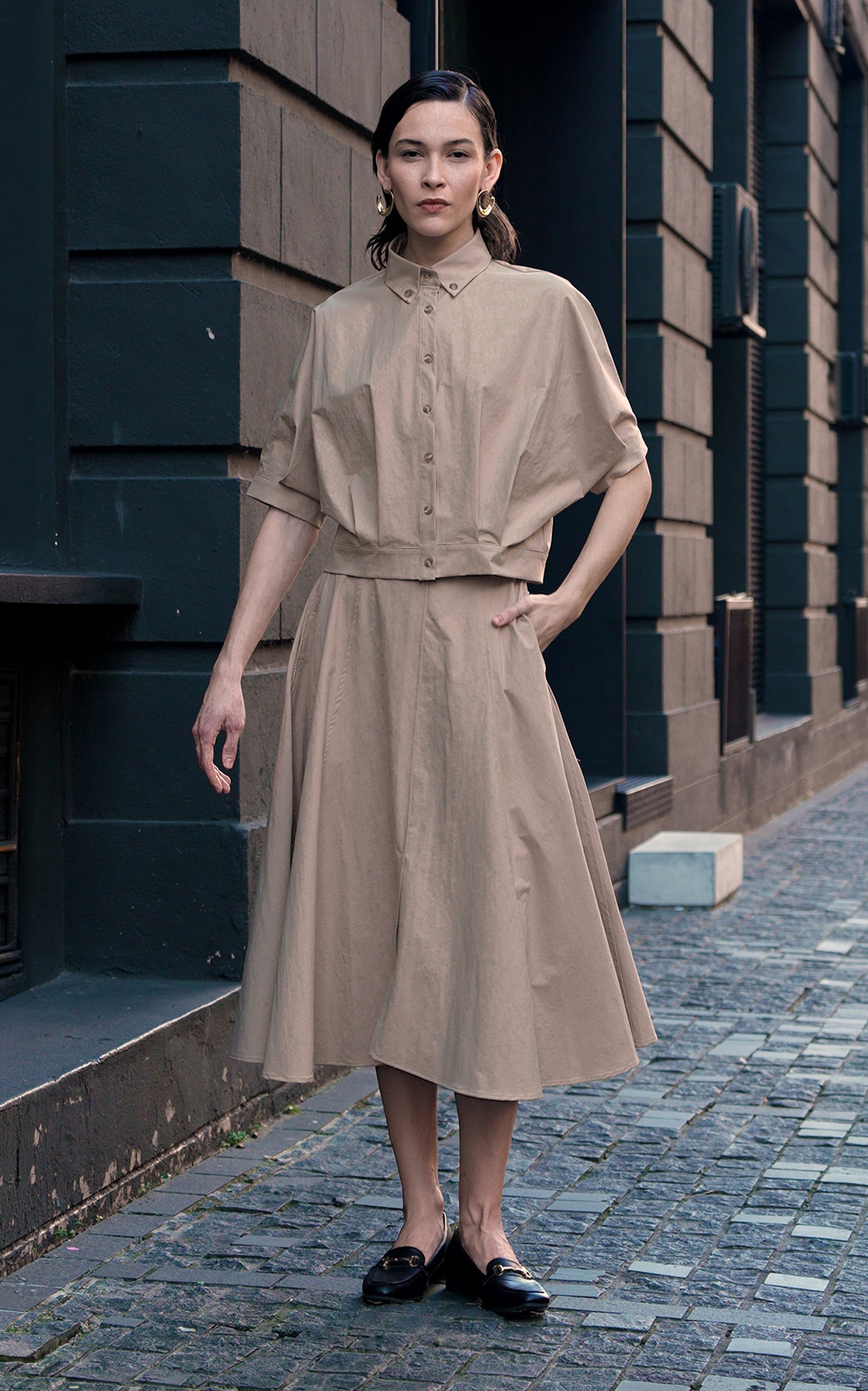 Shirt crafted from airy, easy-care cotton with a softly crinkled texture. Designed with front and back waist pleats that create gentle volume through the batwing sleeves, and finished with buttoned cuffs. Completed with a metal-detailed button-down closure, a cropped length with a banded hem, and an oversized fit.