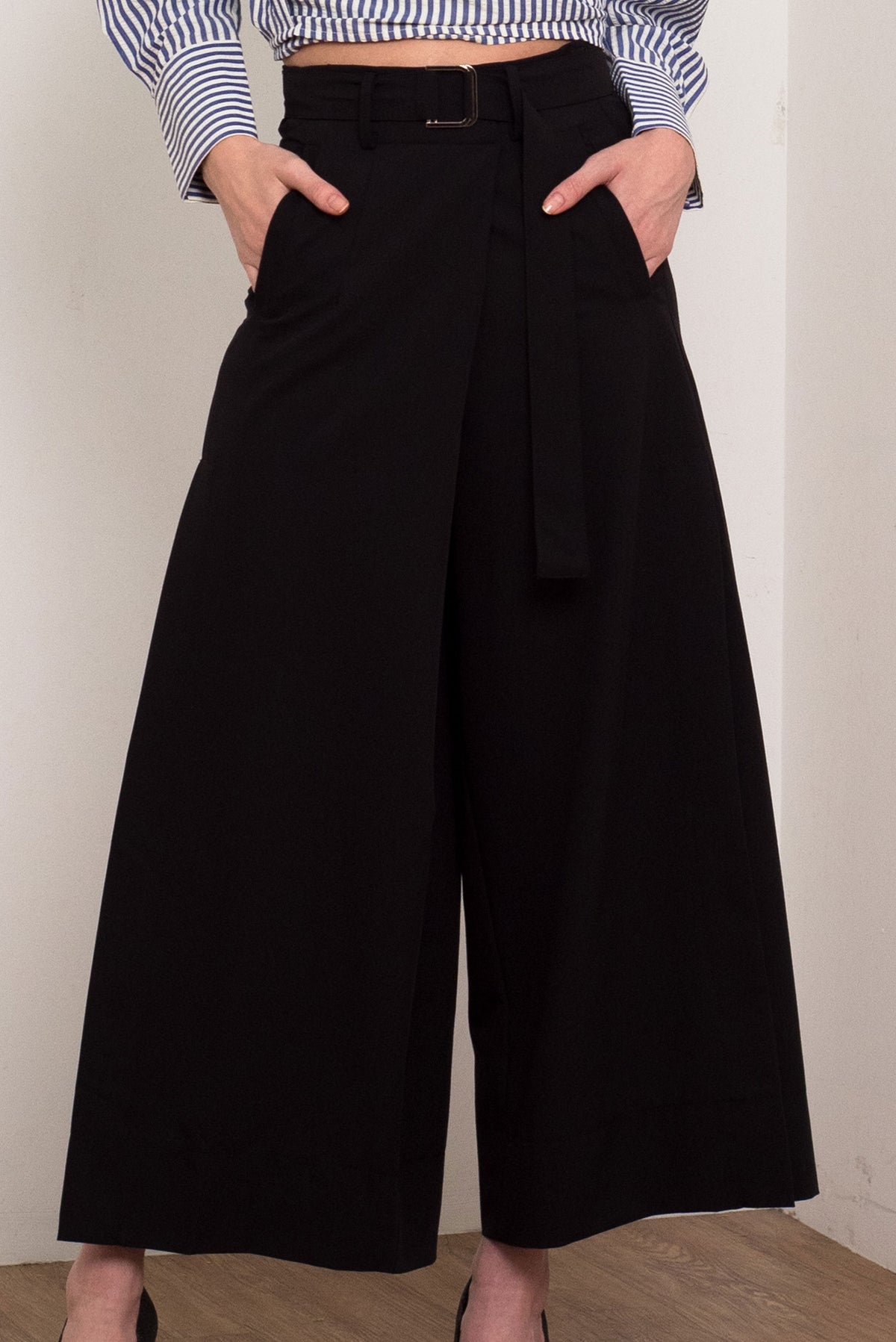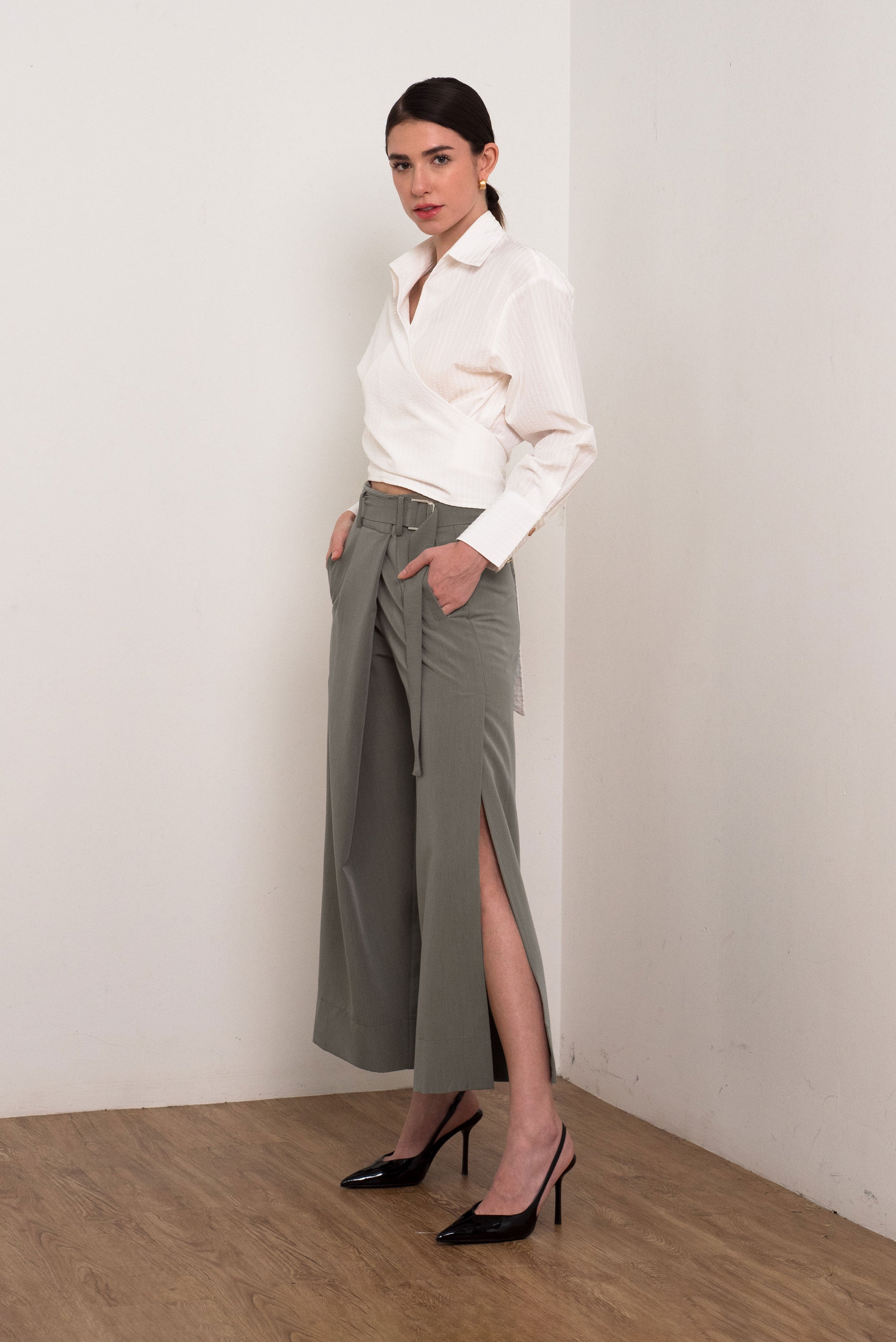 Belted Overlap Slit Suiting Pants