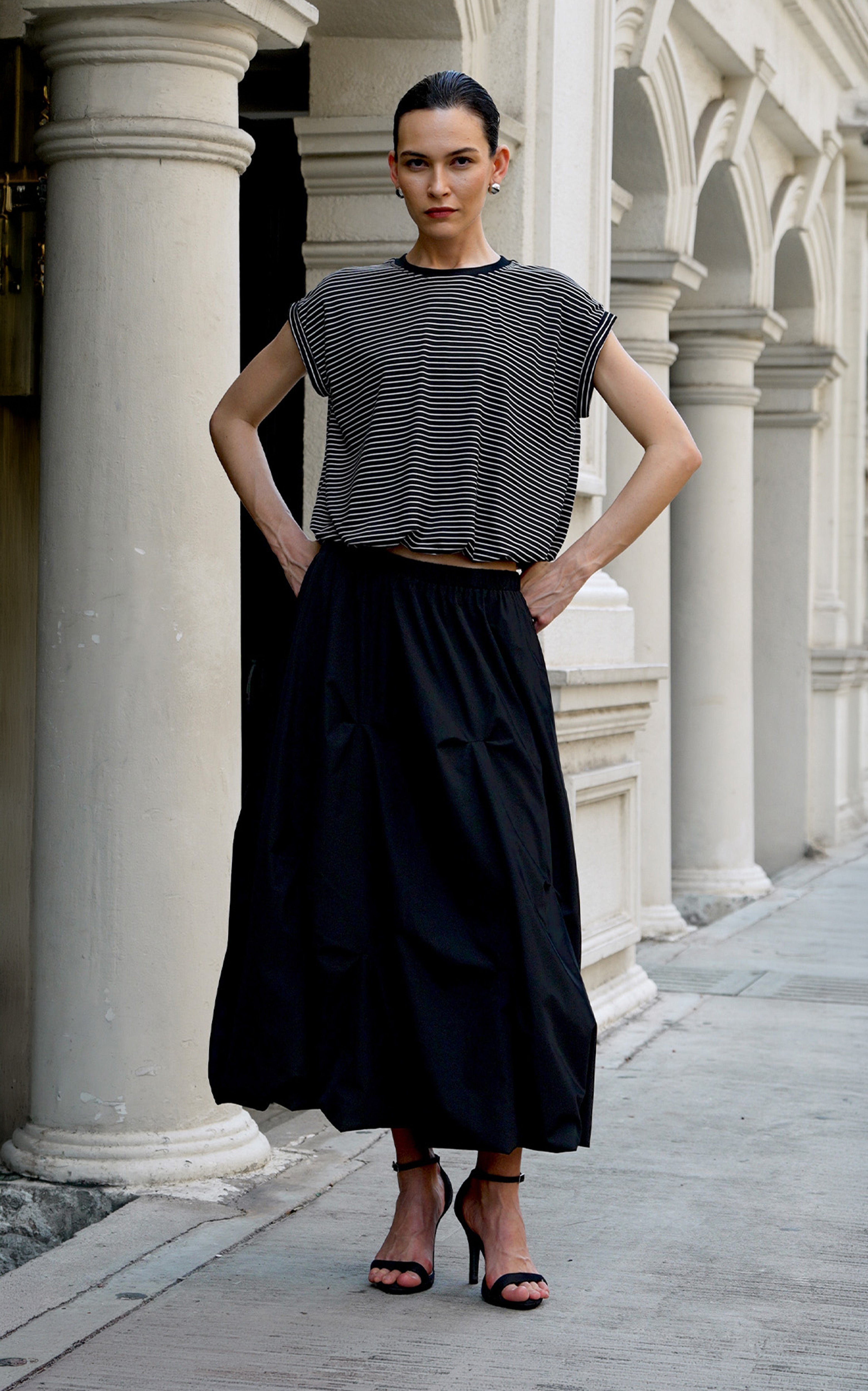 Sleeveless top crafted from soft-stretch striped knit, featuring a crew neckline, dropped shoulders with cuffed details, and an elasticized bubble hem. Fully lined to create a smooth, billowed silhouette.