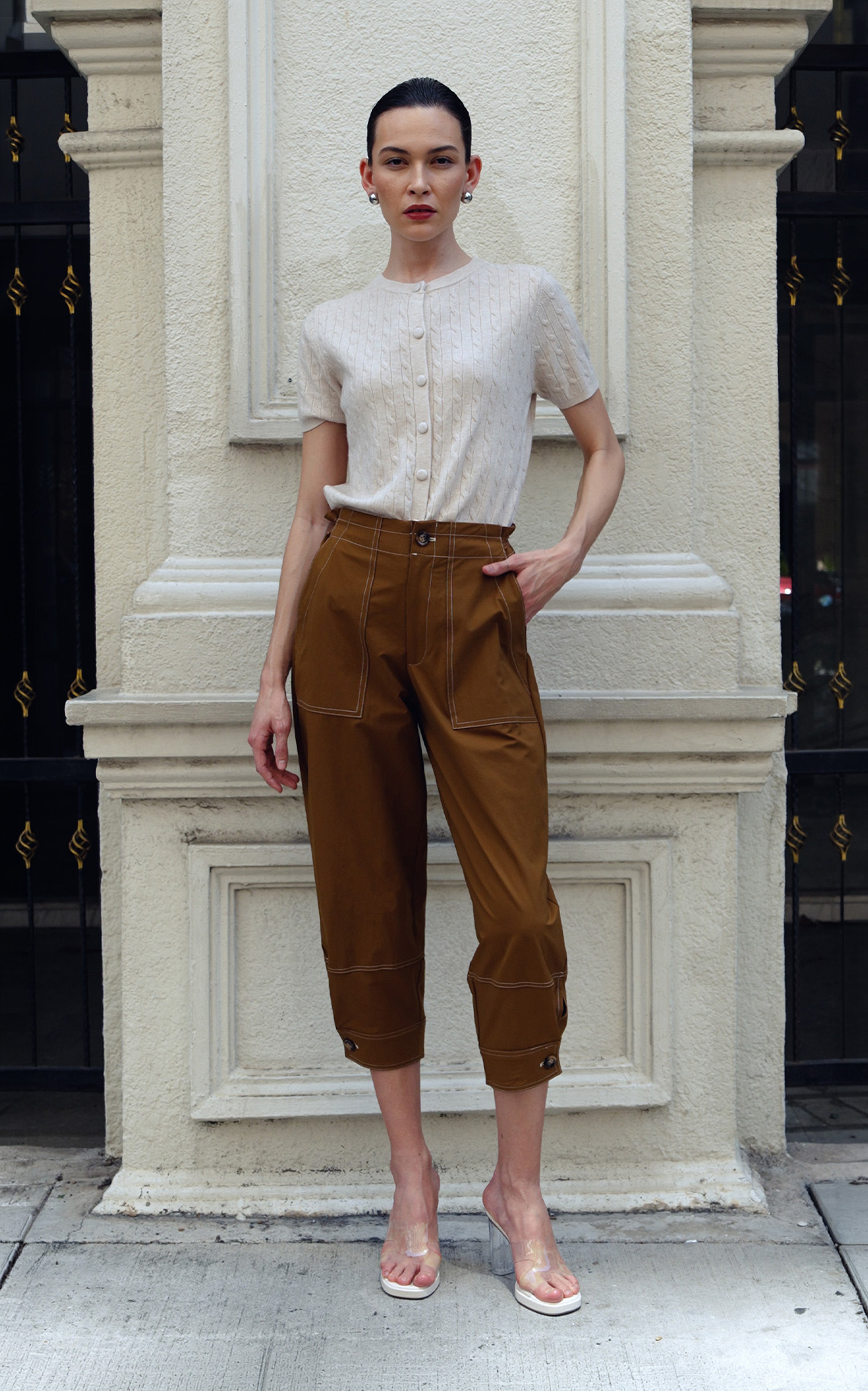 Round-neck top crafted from soft, stretch cable-knit fabric, featuring a front button-down design and rib-knit detailing at the neckline and hemline. Four-way stretch provides both warmth and breathability.